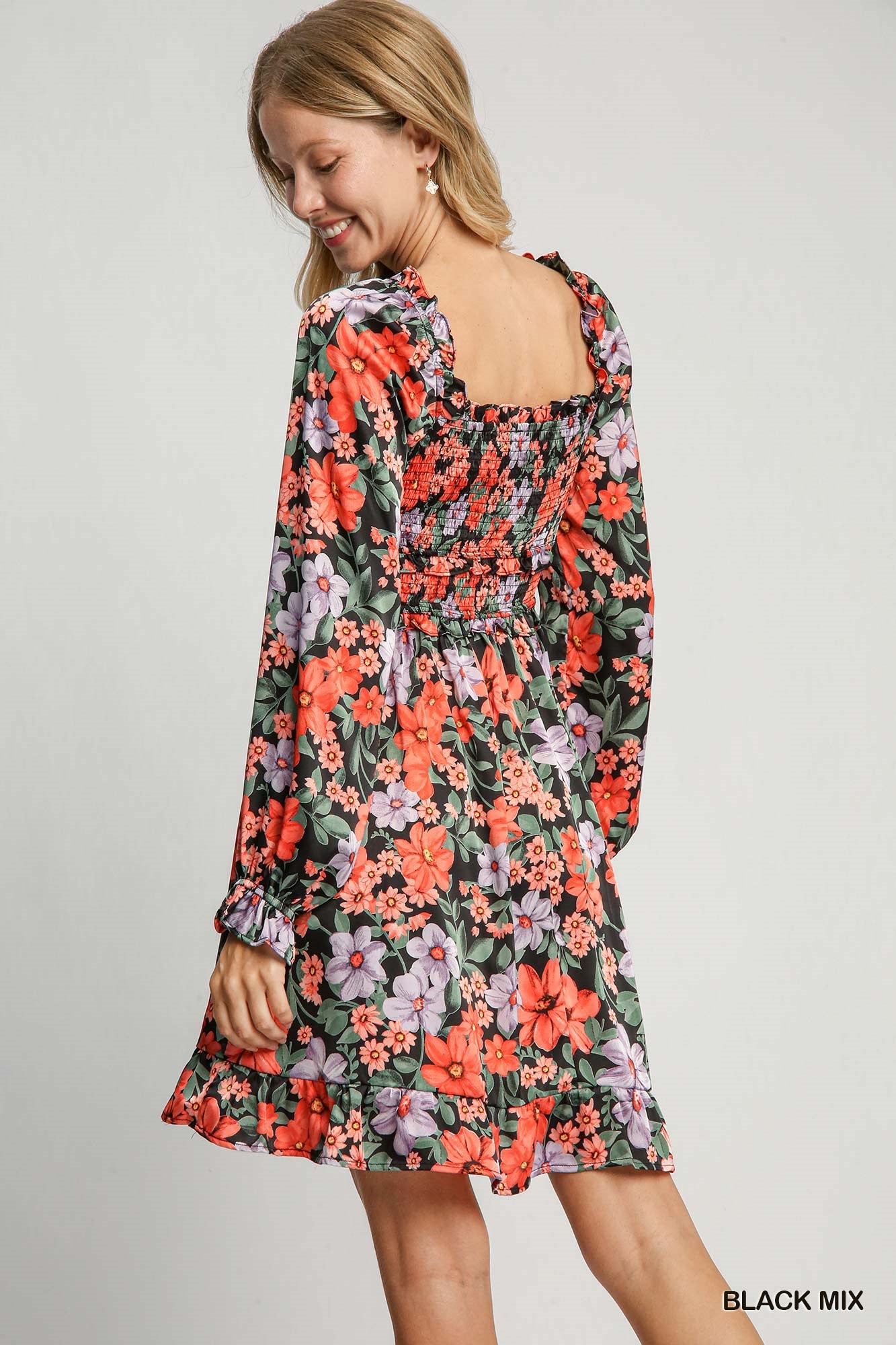 Twirl into spring with this charming floral mini dress! The flattering A-line silhouette pairs beautifully with a squared neckline for a modern touch, while delicate smocking adds texture and dimension through the bodice. A playful ruffle hem keeps things fun and flirty. Perfect for garden parties, brunch dates, or whenever you want to bloom with confidence.
