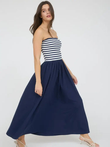 Stripe Knit Top Woven Skirt Mix Media Midi Dress